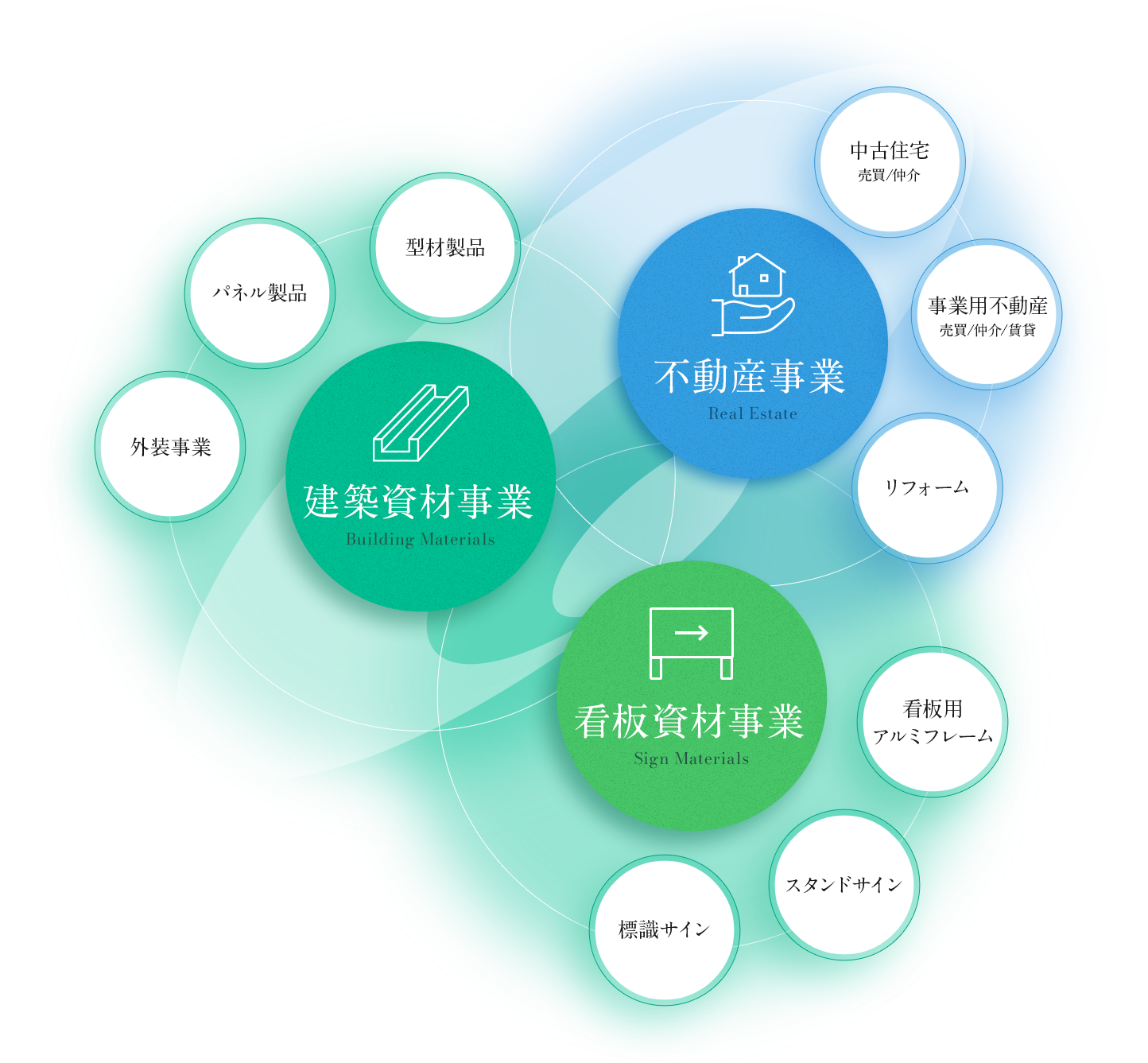 建築資材事業では、マンションや商業施設などに使われるアルミ建材の製造から施工までを一貫して担い、看板資材事業では、軽量かつ耐候性の高いアルミ看板枠を中心とした看板・サイン資材の加工・販売を担い、不動産事業では、中古住宅の販売やリフォームなどを手掛けています。